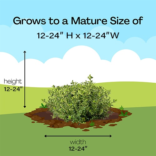 A fully-grown Renaissance stands tall at 1-2’ and spreads out to a width of 1-2’, presenting numerous potential applications and positioning options. Picture a pristine low hedge or an intricately shaped topiary, retaining its verdancy from winter’s chill to summer’s peak with minimal maintenance. That is the essence of what this Boxwood has to offer.