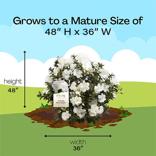 The Autumn Moonlight is an Encore Azalea that produces an abundant display of beautiful white double blooms in spring summer and fall. The beautiful blooms contrast nicely against the dark lustrous green foliage. The Autumn Moonlight is cold hardy down to USDA zone 7. Encore Azaleas are known for their ability to tolerate full sun better than traditional azaleas, so make sure to plant them in a location that will receive 4-6 hours of direct sunlight, with some shade during the afternoon heat. Encore Moonlight is great for planting in the landscape or in container gardens and will perform best in slightly acidic well-drained garden soil.
