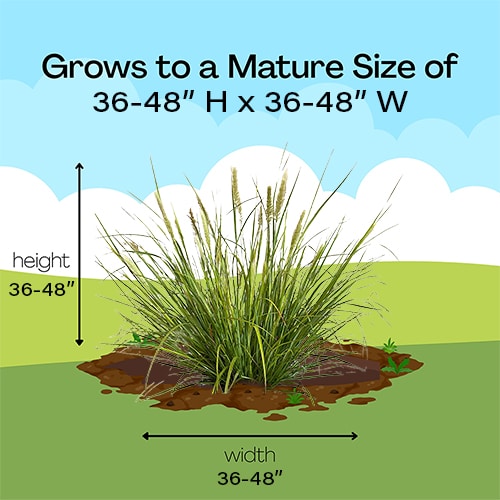 This large fountain grass makes a beautiful focal point in the fall garden. Showy bottlebrush-shaped flowers emerge dusky purple and age to tan atop the upright vase-shaped clump of green foliage which takes on red, orange, and gold tones in fall. Perfect for containers, landscapes, and as accents!