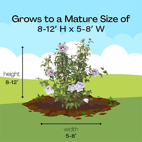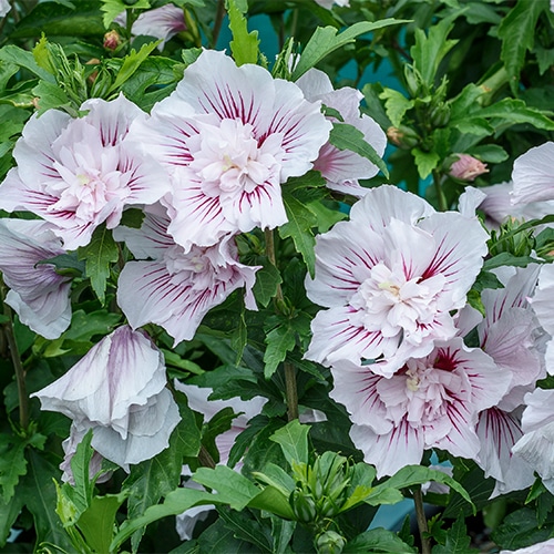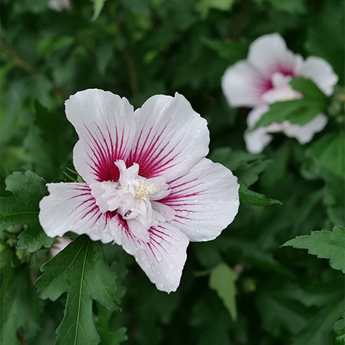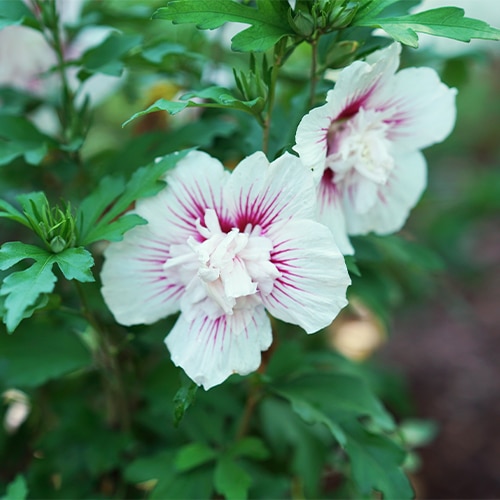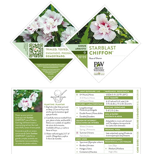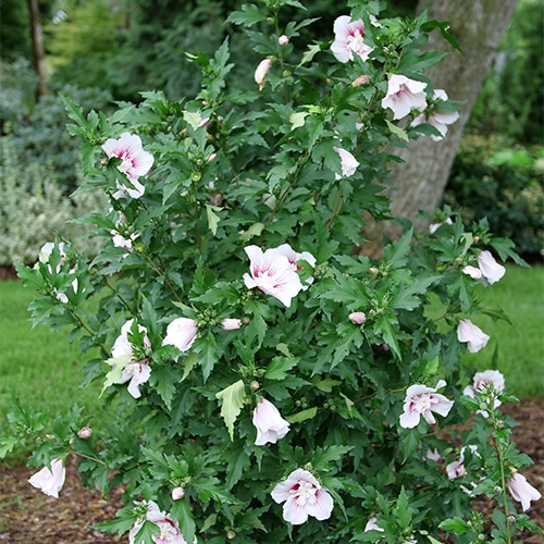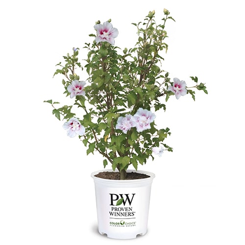 Flowering earlier and for longer than many other varieties, Starblast Chiffon rose of Sharon is the hero of the garden. Each of its brilliant white flowers has a fluffy doubled center, highlighted by a dramatic hot pink starburst center. It has the same nicely rounded habit as the other members of the Chiffon series, perfect for using in a border or as a specimen.