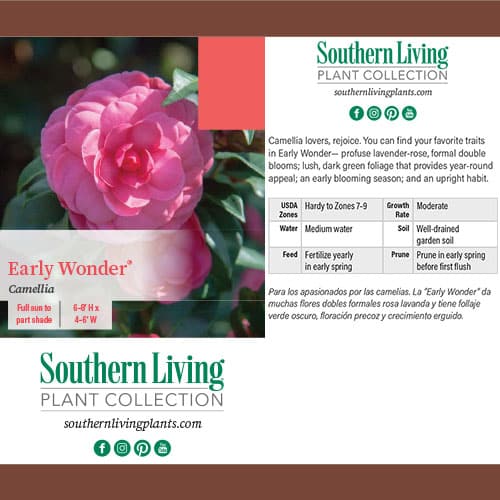 The Early Wonder Camellia from the Southern Living Plant Collection is a Camellia japonica variety, therefore, it has many of the qualities people love about this breed of plants. However, most Japonica varieties begin blooming in late fall to early winter, and that’s where the Early Wonder breaks the mold. This selection begins blooming in Fall, a time when traditionally only Camellia sasanqua varieties are in bloom! And these flowers are absolute show-stoppers. Each bloom is a large, formal, and rosy pink with double petals. You won’t get tired of looking at these blossoms anytime soon, which is good because they emerge in huge numbers.