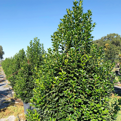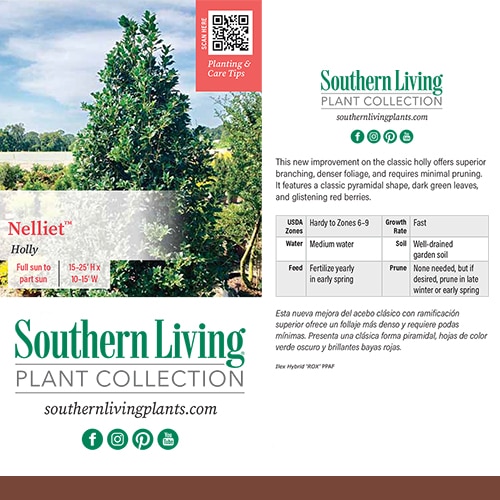Introducing a new take on an old classic. The Nelliet holly tree is a fantastic upright holly from the Southern Living Plant Collection. This new improvement on the classic holly offers superior branching, denser foliage, and requires minimal pruning. It features a classic pyramidal shape, dark green leaves, and glistening red berries. Once achieving the appropriate height, this plant is ideal as a nearly impenetrable privacy screen. Just try and make it through this heavy-duty beauty! When Nelliet is still young, you can plant it in containers for a bright, evergreen accent that holds its shape. You can fill in around it with annuals or perennials to provide a spark of color and truly eye-catching container planting. This holly is also bright enough to stand on its own in a container.