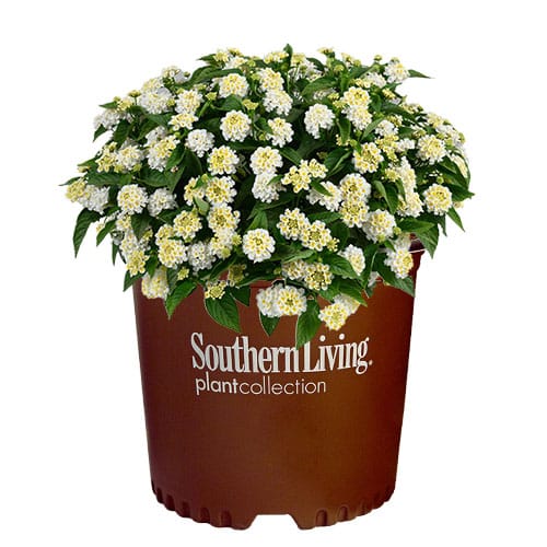 Lantana from the Southern Living Plant Collection provides bold blossom color nearly all growing-season long! This perennial produces gorgeous clusters of white blooms with creamy yellow centers. Moreover, their bloom season begins up to three weeks earlier than other lantanas! These blossoms continuously rebloom until the first frost of the year. The leaves are brilliant green with light hairiness to them. Each leaf is slightly serrated and deeply lobed, with a point on the end. Also, this foliage is deciduous, which means that it will lose its leaves in winter. This Lantana has a reliably dense and compact growth habit, and won’t get leggy like most lantanas. Therefore, it opens up a lot of opportunities in the landscape. Use it in a container or in the foreground of mixed garden beds.